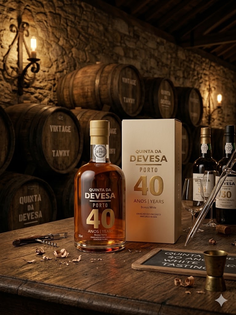 En sjælden og ekstraordinær White Port fra den anerkendte Quinta da Devesa ved bredden af Douro-floden. Skabt af omhyggeligt udvalgte druesorter fra den Afmærkede Douro-region og naturligt lagret på egetræsfade i Quinta da Devesas egne kældre gennem mere end 40 år.